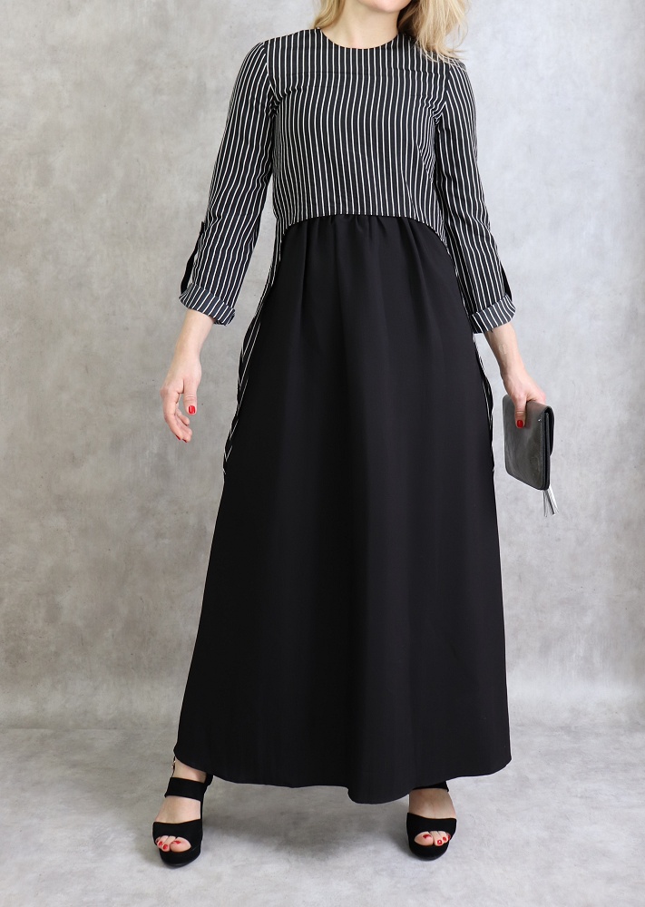 Robe longue, col rond, fermeture glissière au dos, manches ajustables, tissu opaque, effet deux pièces cousues.