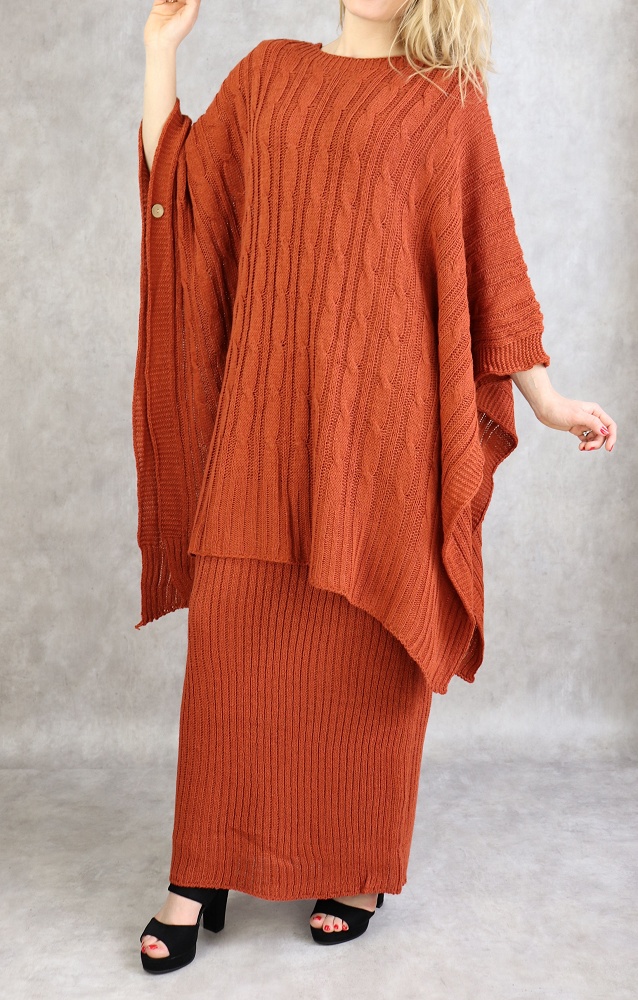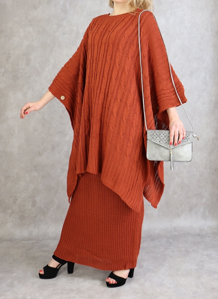 Ensemble robe et poncho grosse maille pour femme - Couleur Rouille Vetement & Accessoire