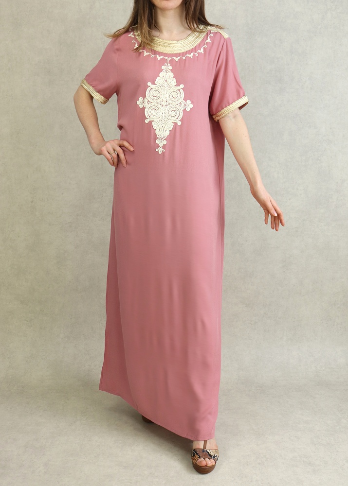 Robe tunisienne manches courtes avec broderies - Couleur Vieux Rose