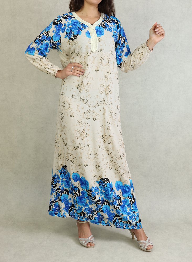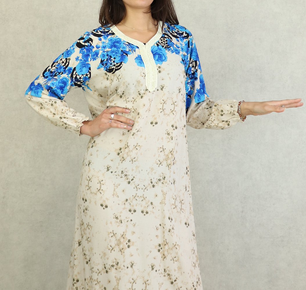 Robe d’intérieur avec motifs à fleurs sur fond beige. Col V avec broderies sur l'avant, manches longues finition élastiques aux poignets.