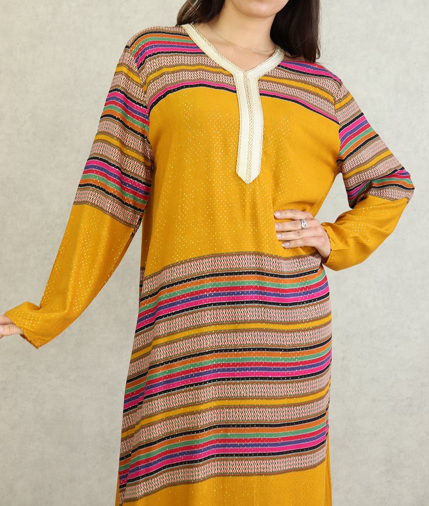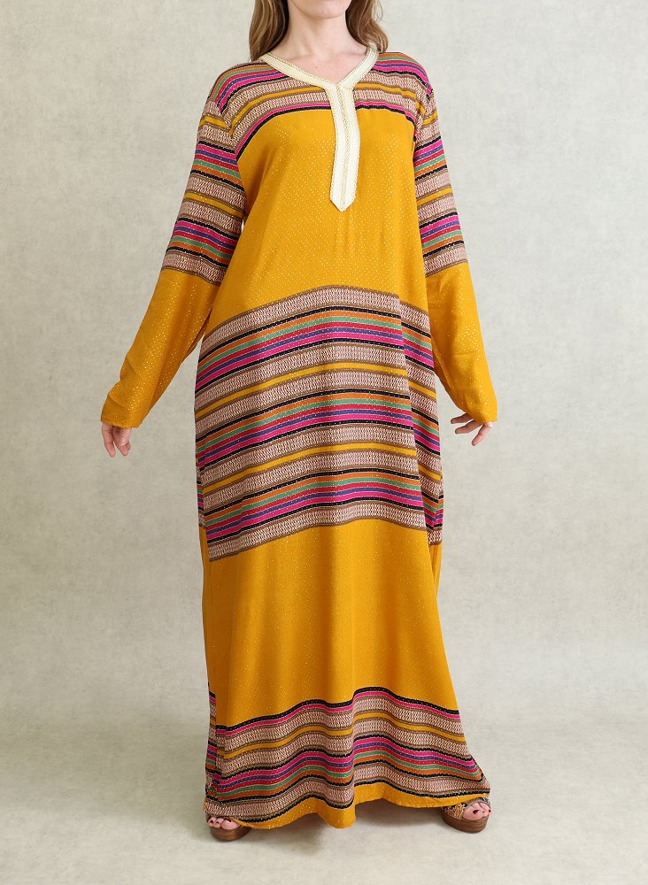 Robe orientale manches longues à paillettes brillantes. Avec rayures horizontales multi-Couleurs. Coupe droite, col V. On aime son tissu au toucher et un tombé fluide et confortable. Agréable robe d'été et toutes saisons pour la maison.
