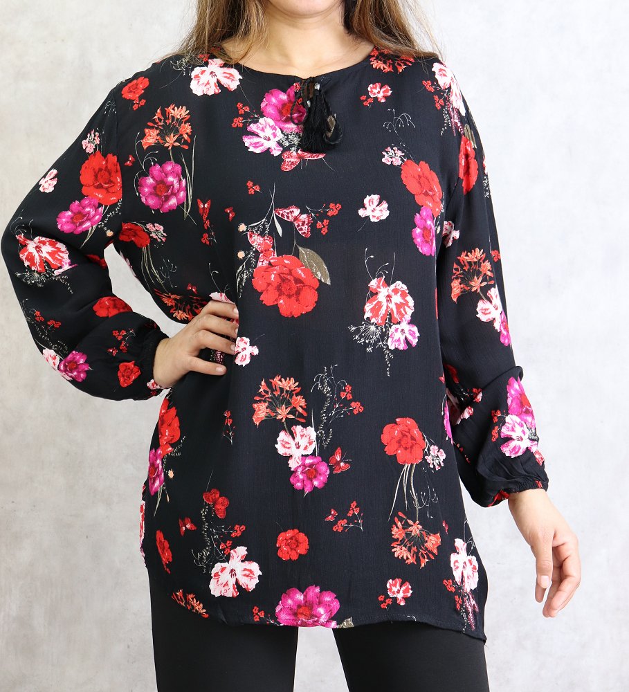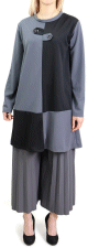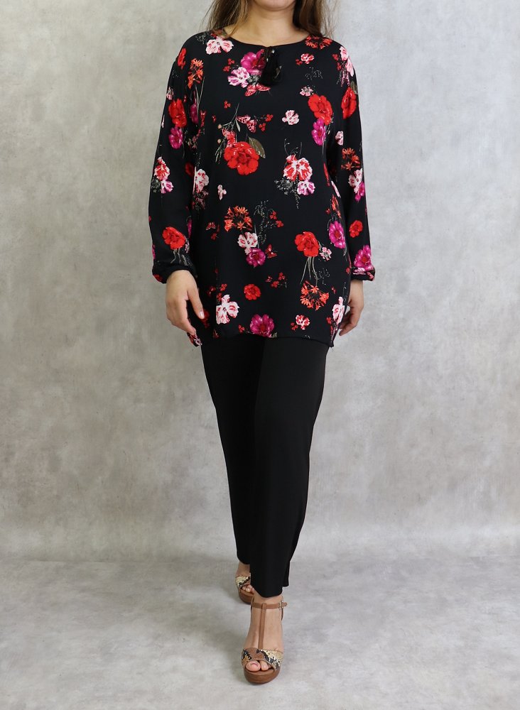 Tunique courte, col dégagé, lien de serrage, manches longues finition élastiques aux poignets. Coupe droite, tissu fluide et léger.