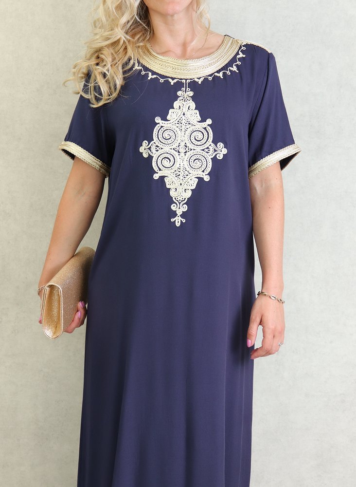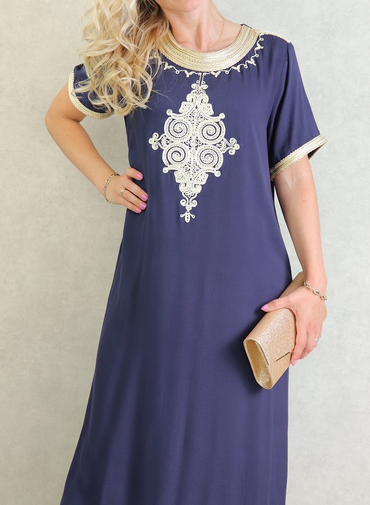 Robe tunisienne manches courtes avec broderies - Couleur Bleu Marine