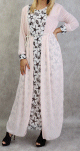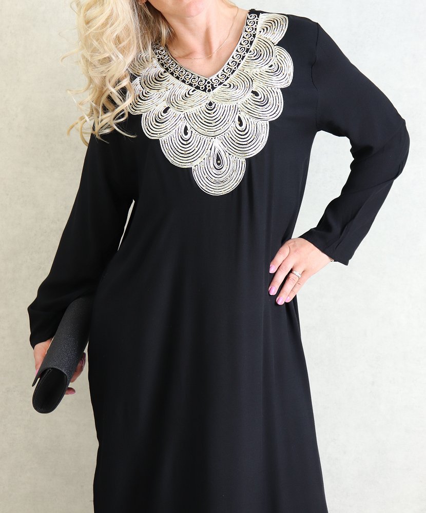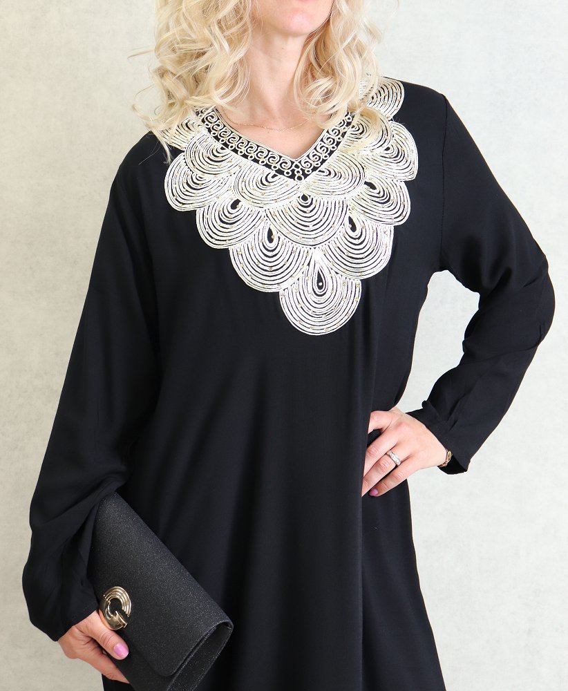 Robe style orientale joliment décorée de broderies dorées et perles nacrées sur le col en V.