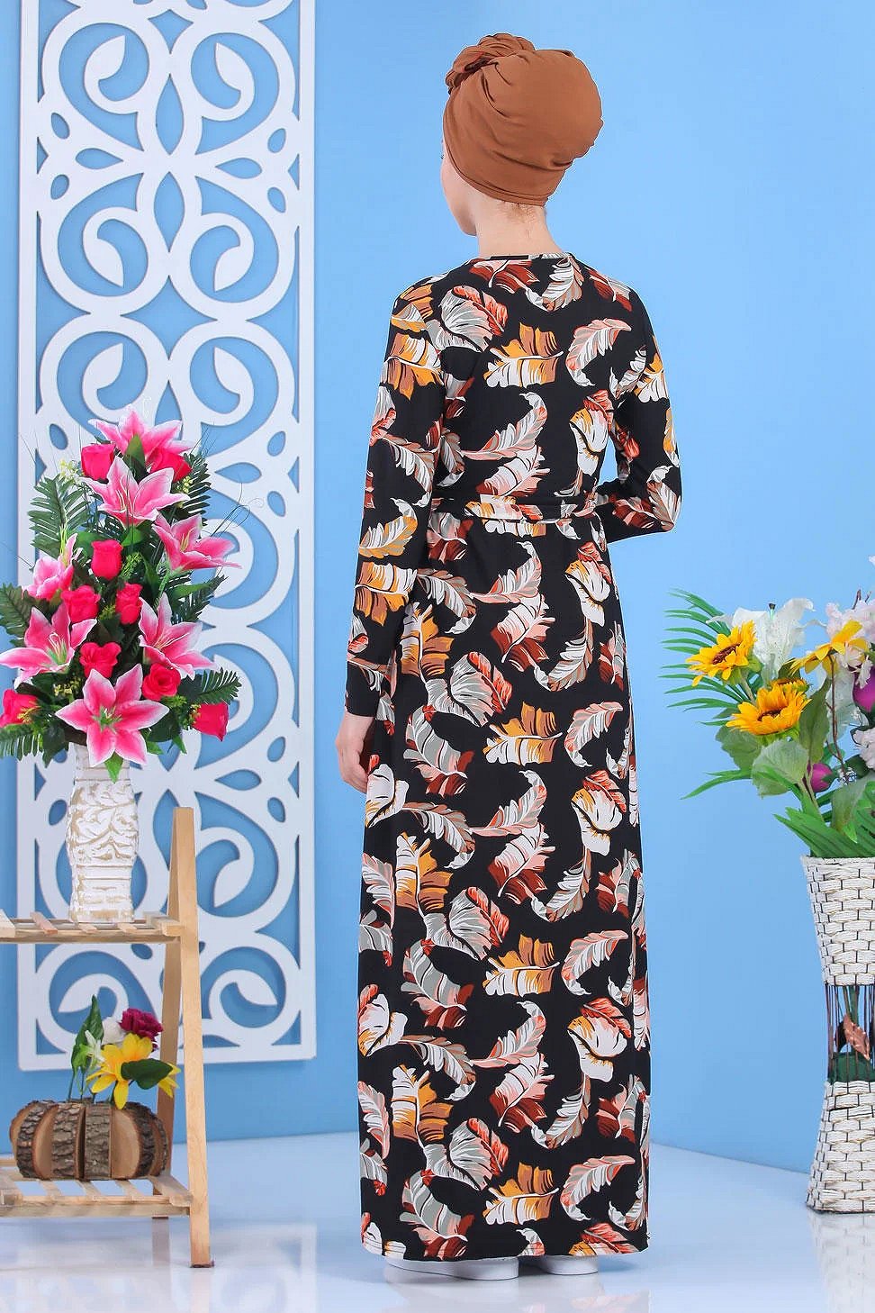 Robe légère et son imprimé tropical qui donne envie d'évasion, col rond, manches longues, taille cintrée et avec une ceinture assortie.