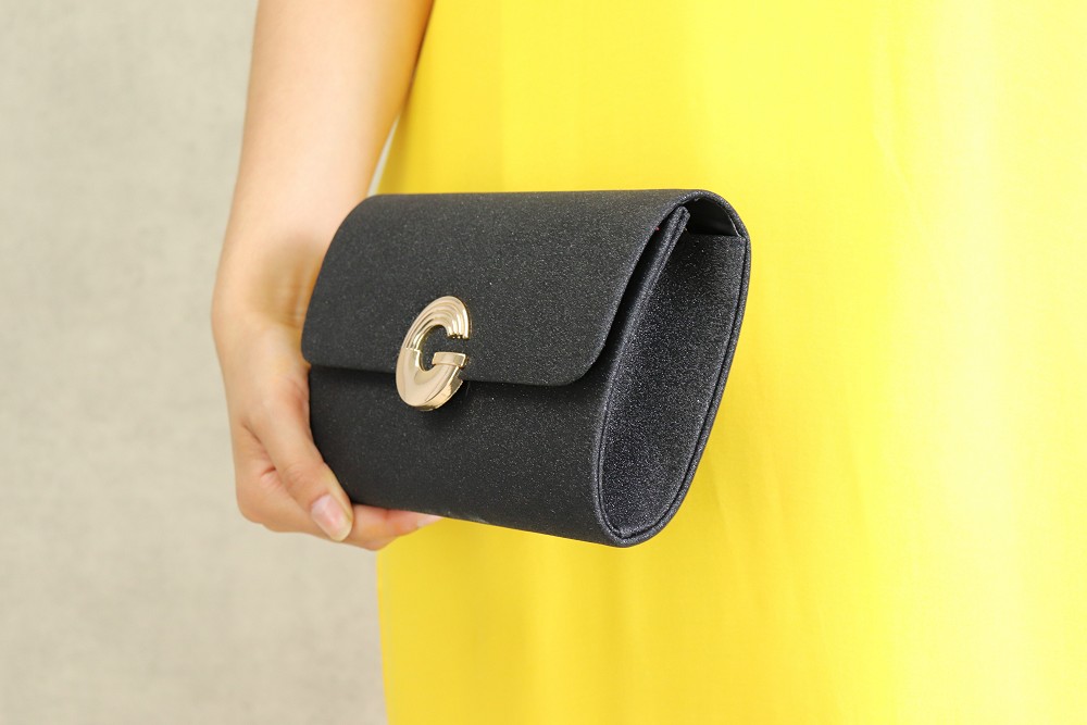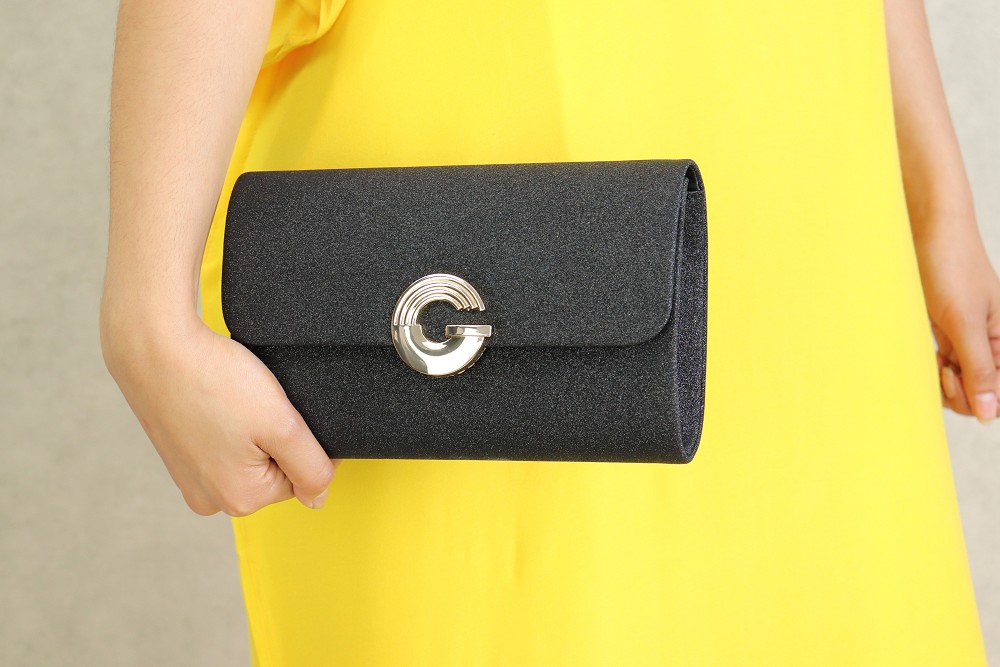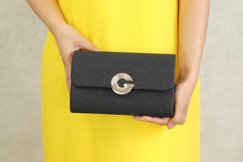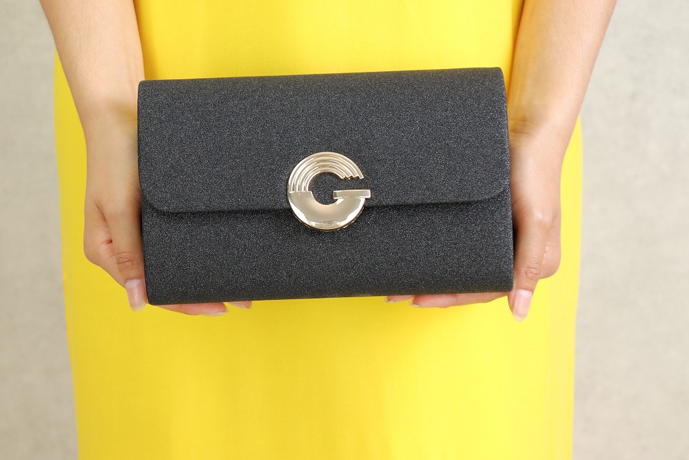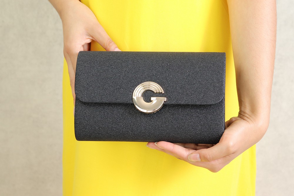 Pochette et Sac bandoulière pailleté. Rabat fermé par pression magnétique avec logo sous forme de G en métal. Une fine bandoulière en métal amovible complète ce modèle et permet de la porter aussi en bandoulière. Une petite poche de service permet de ranger vos clés ou de petits objets.