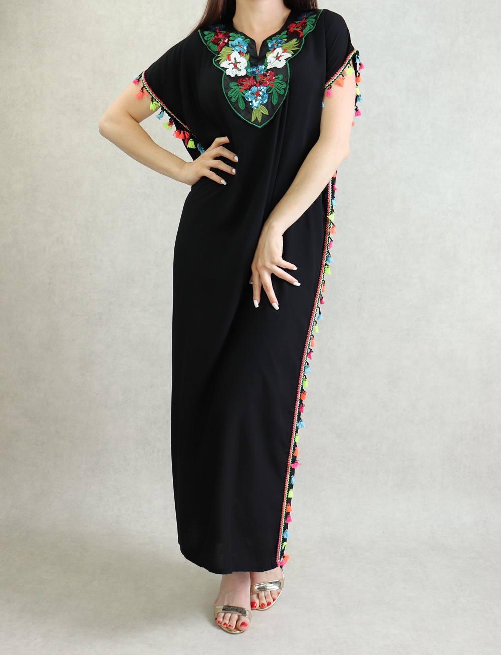 Cette belle robe longue coupe droite, ornée avec de jolis strass et motifs fleuris. Décorerée sur les côtés avec des pompons multi couleurs.