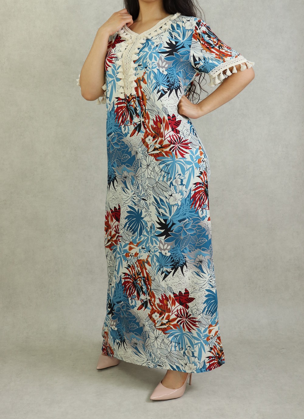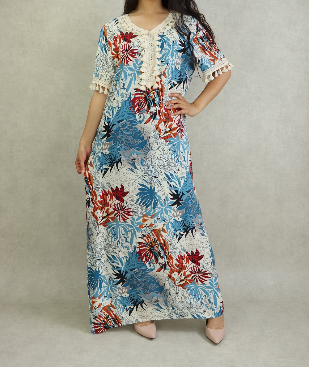 Robe longue d'été ou pour la maison à imprimé exotique pour femme, manches courtes avec broderies et pompons beige, coupe droite, tissu fluide et doux au toucher coton.