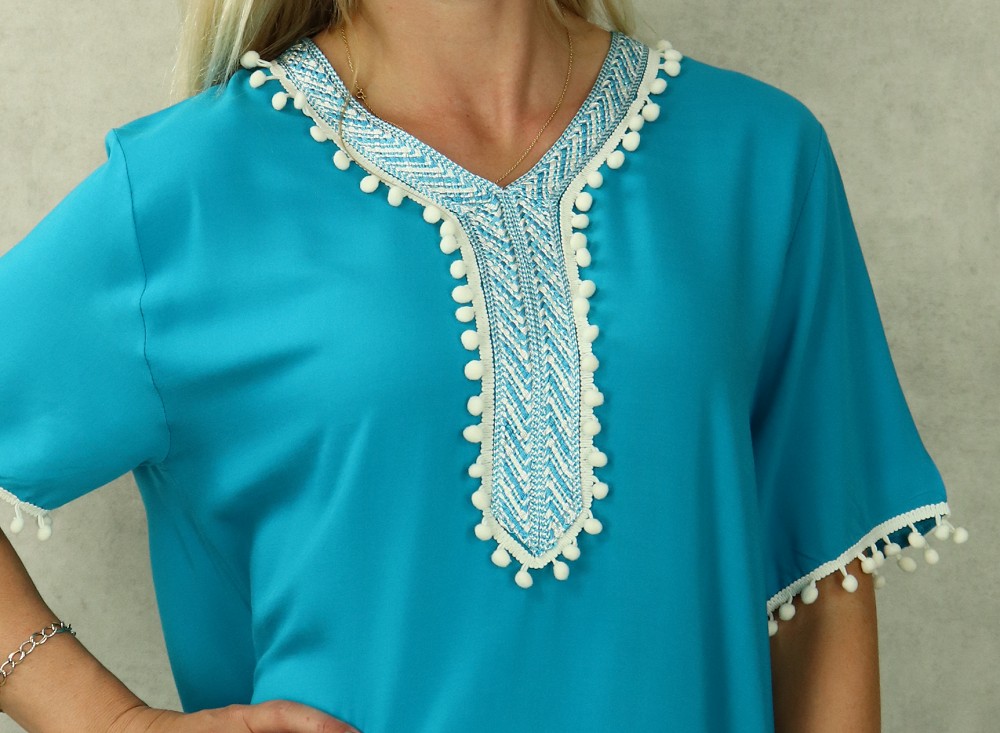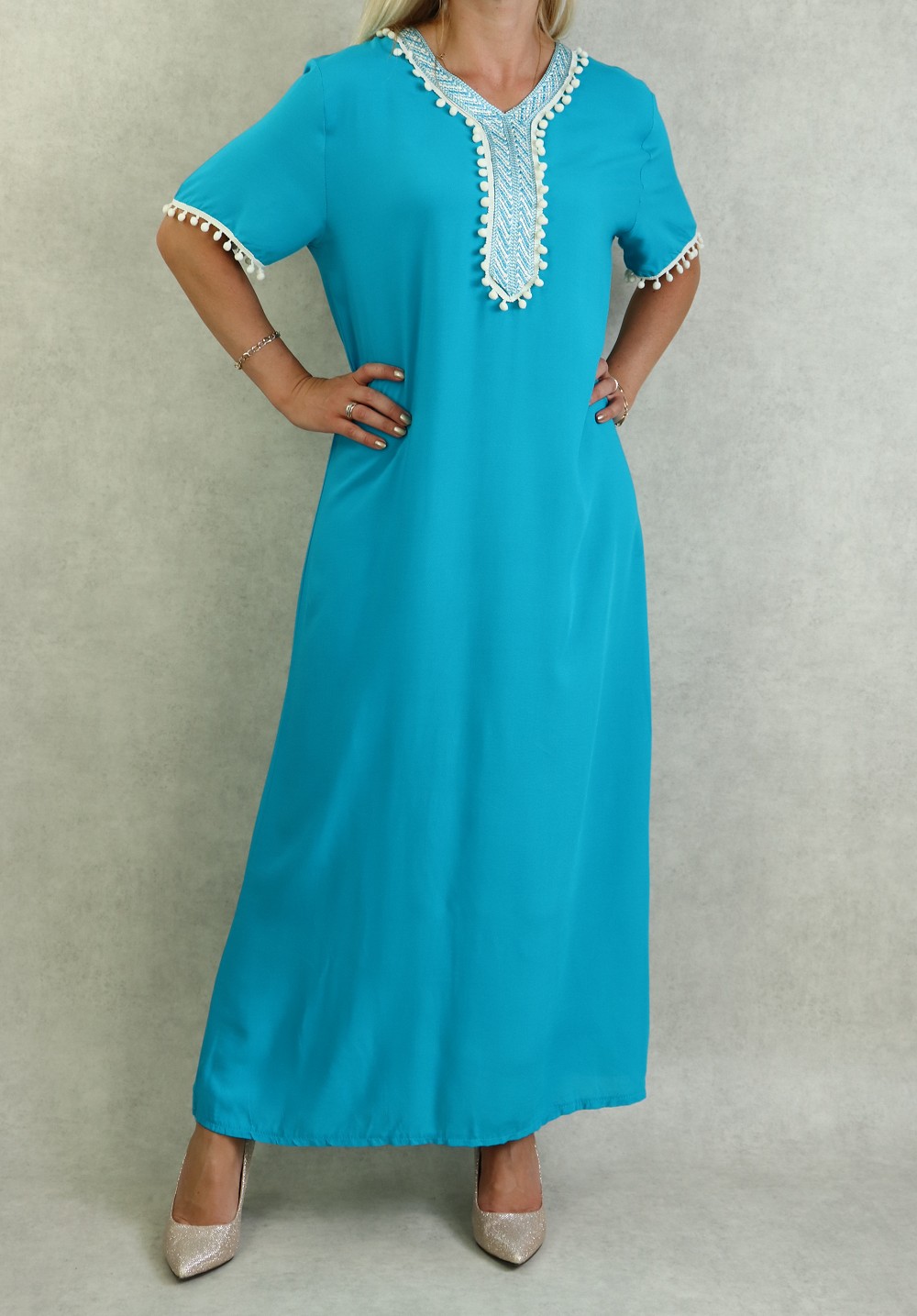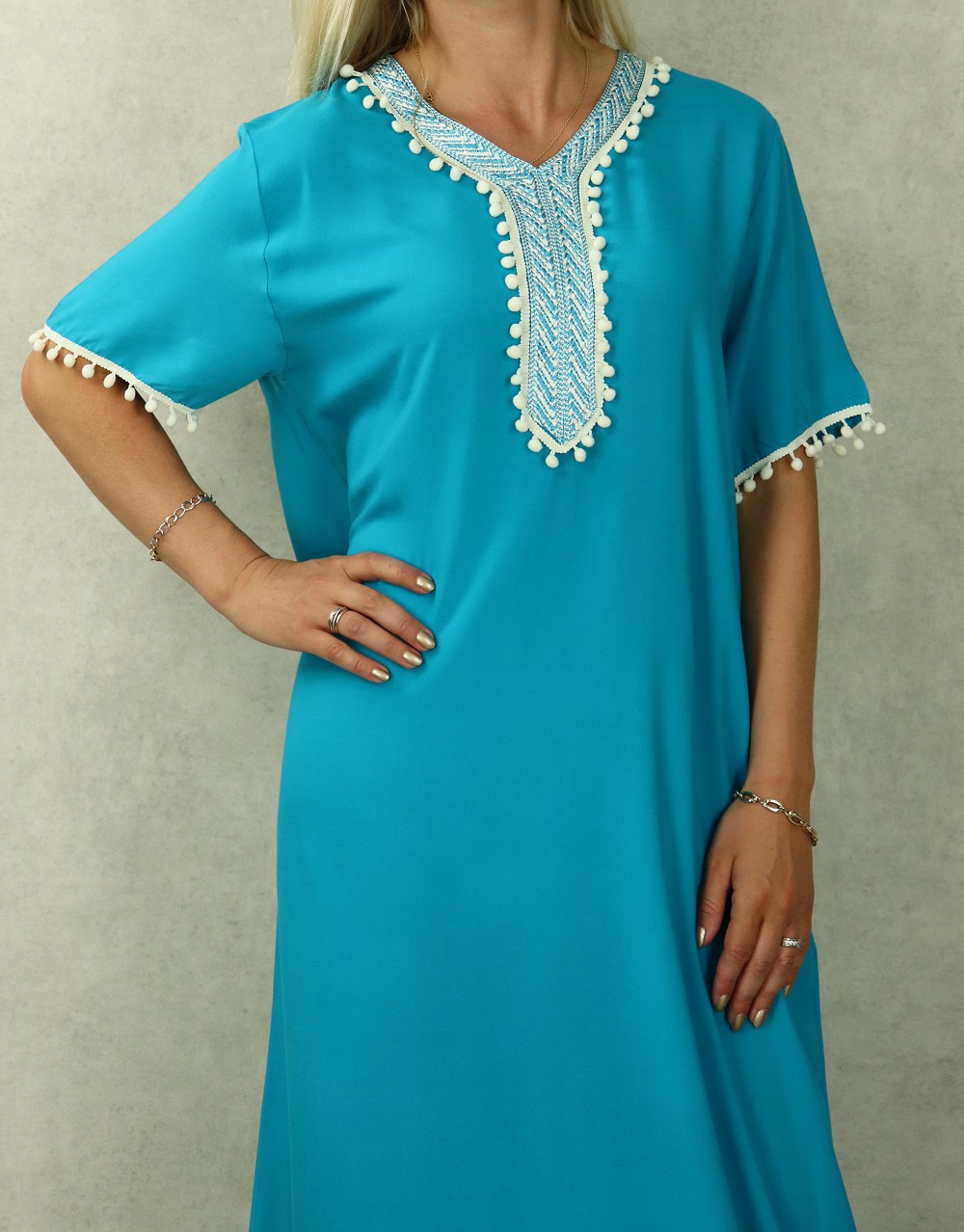 Robe marocaine traditionnelle brodée pour femme - Manches courtes - Couleur Bleu ciel - REF. 29828 (35.00 €)
