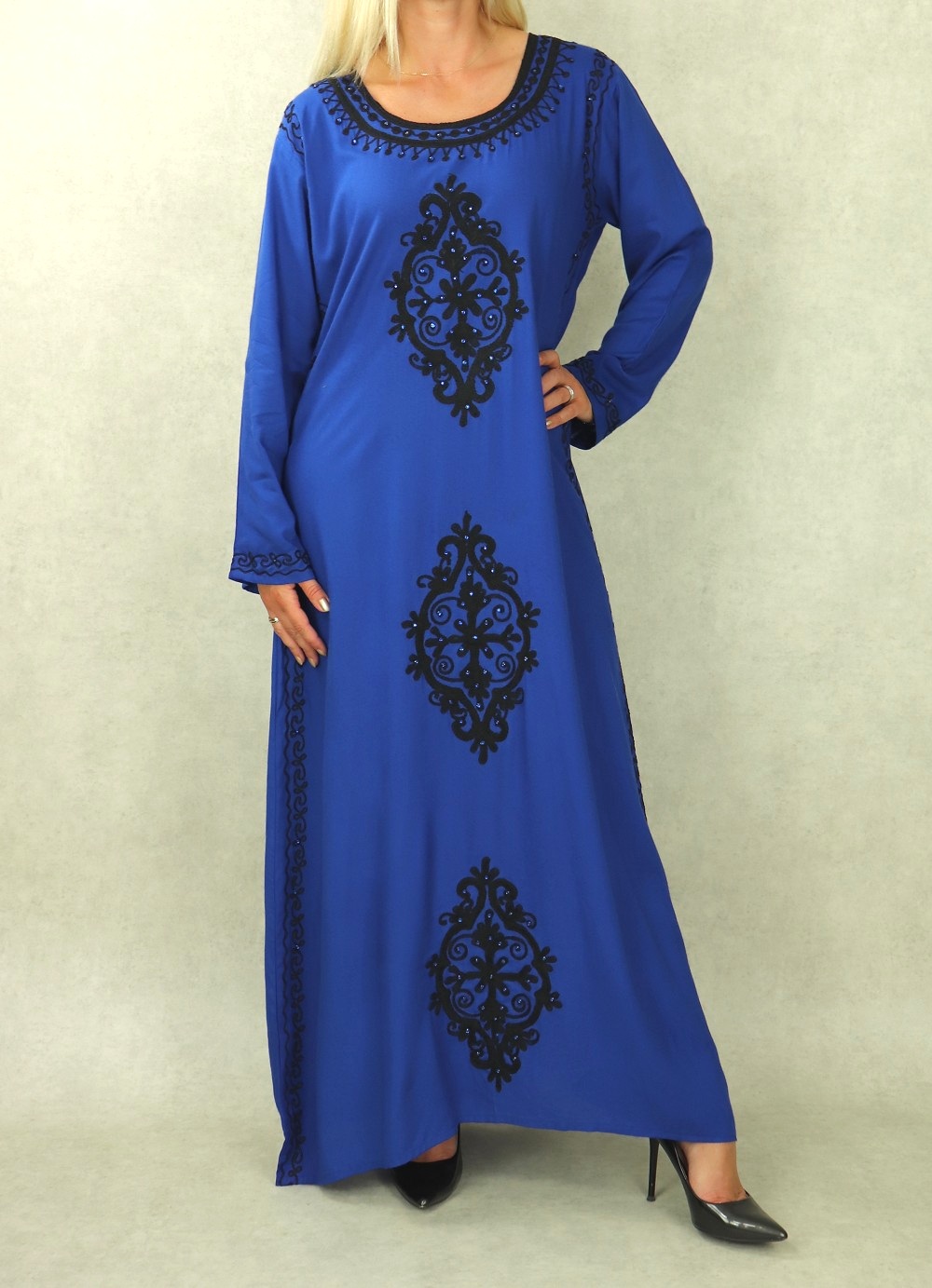 Cette robe originale à manches longues est conçue d'un tissu de type coton, elle est douce et agréable à porter et non transparente. Elle est décorée de nombreuses broderies ornées de strass assortis de la même couleur que la robe.