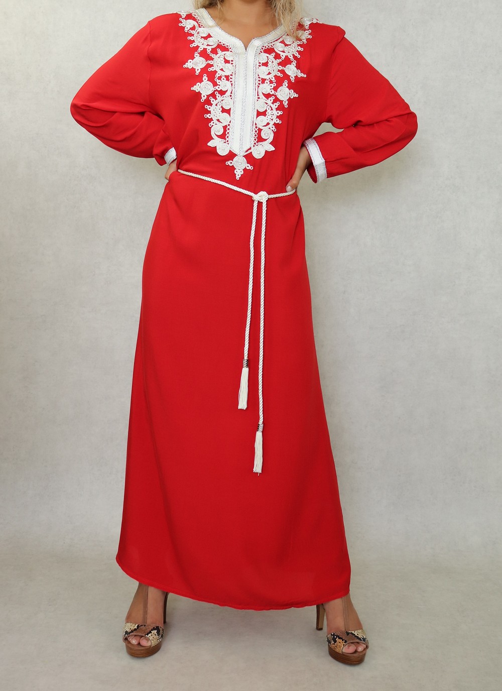 Robe longue, col en V, manches longues ornées de broderies sur les poignets ainsi que sur le buste. Coupe droite, tissu fluide et doux.