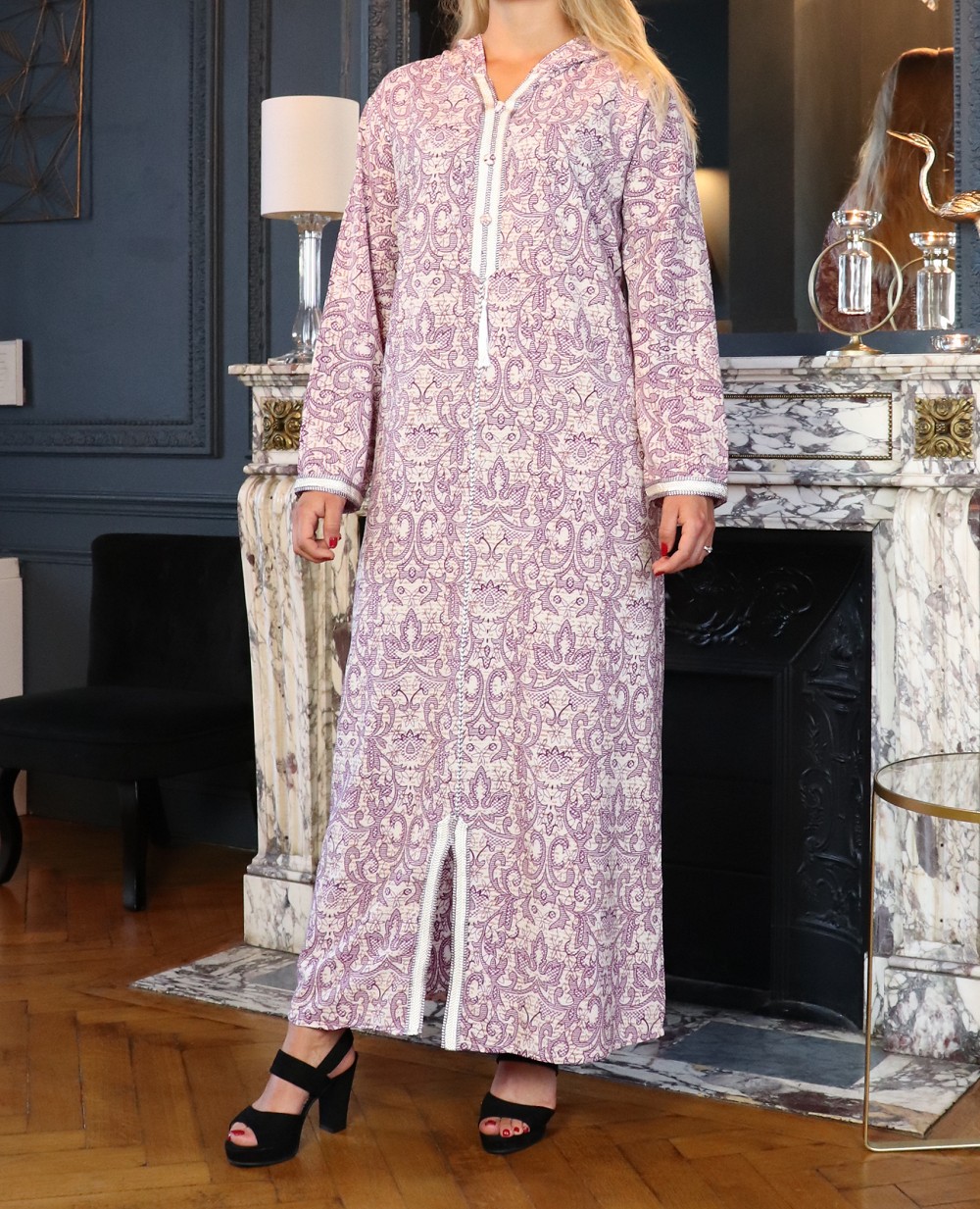 Robe longue, col en V, Manches longues, fluide et légère à fleurs, avec un liseré autour de la capuche, manches et ainsi sur le buste.