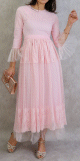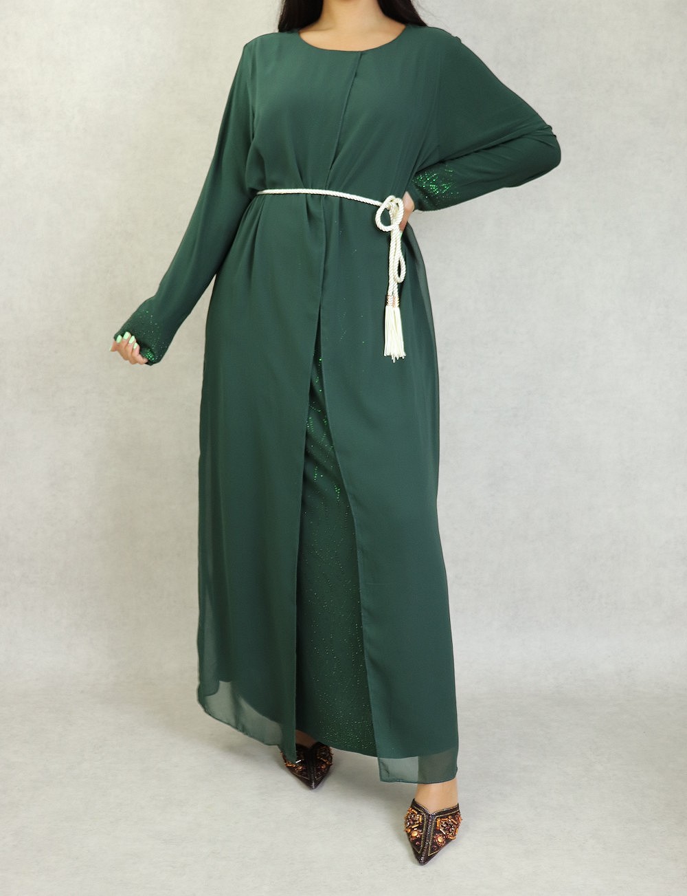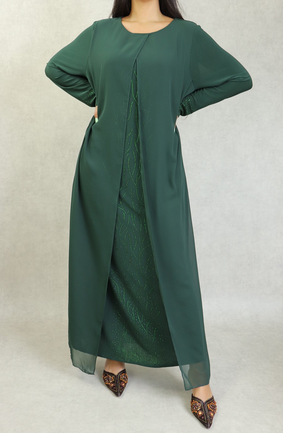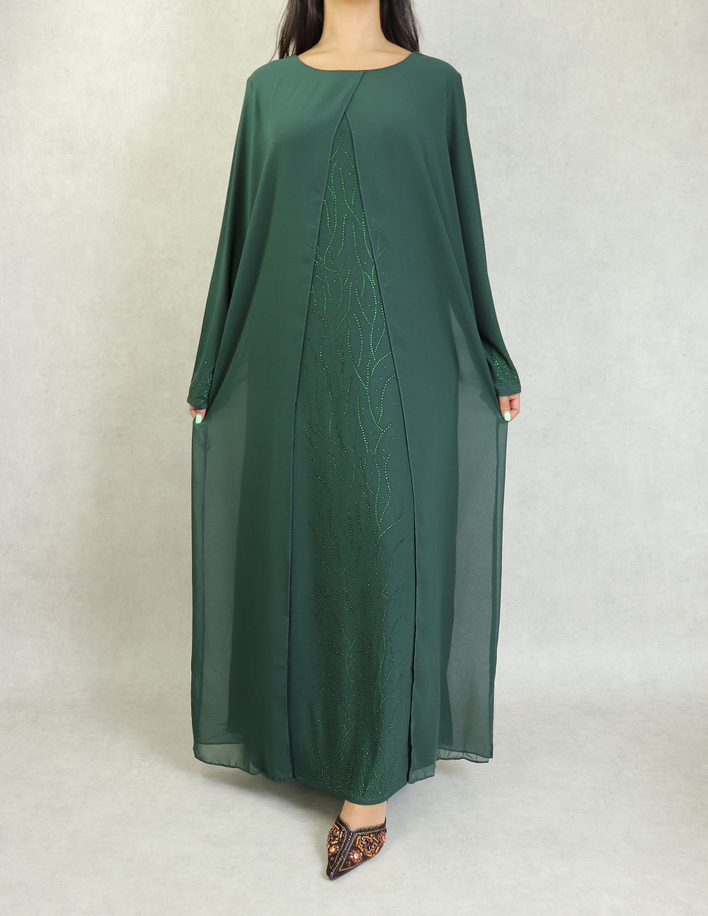 Cette robe longue avec kimono intégré, ornée avec des magnifiques strass de la même couleur que la robe sur tout la longueur et au niveau des poignets, coupe évasée, tissu fluide est très léger.