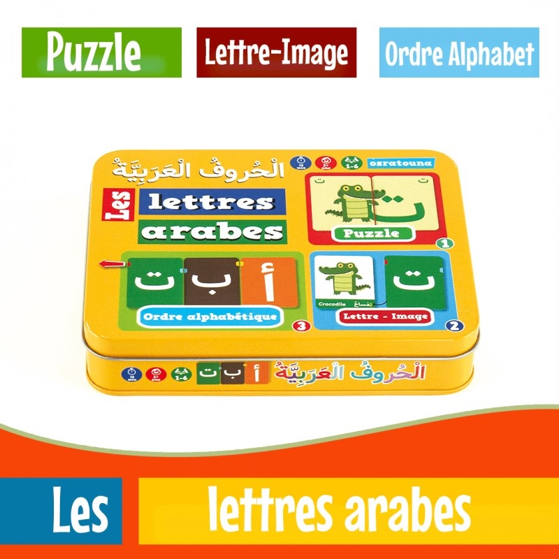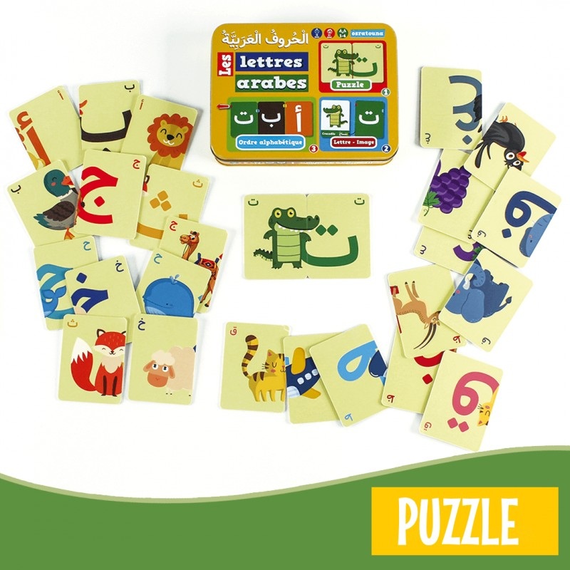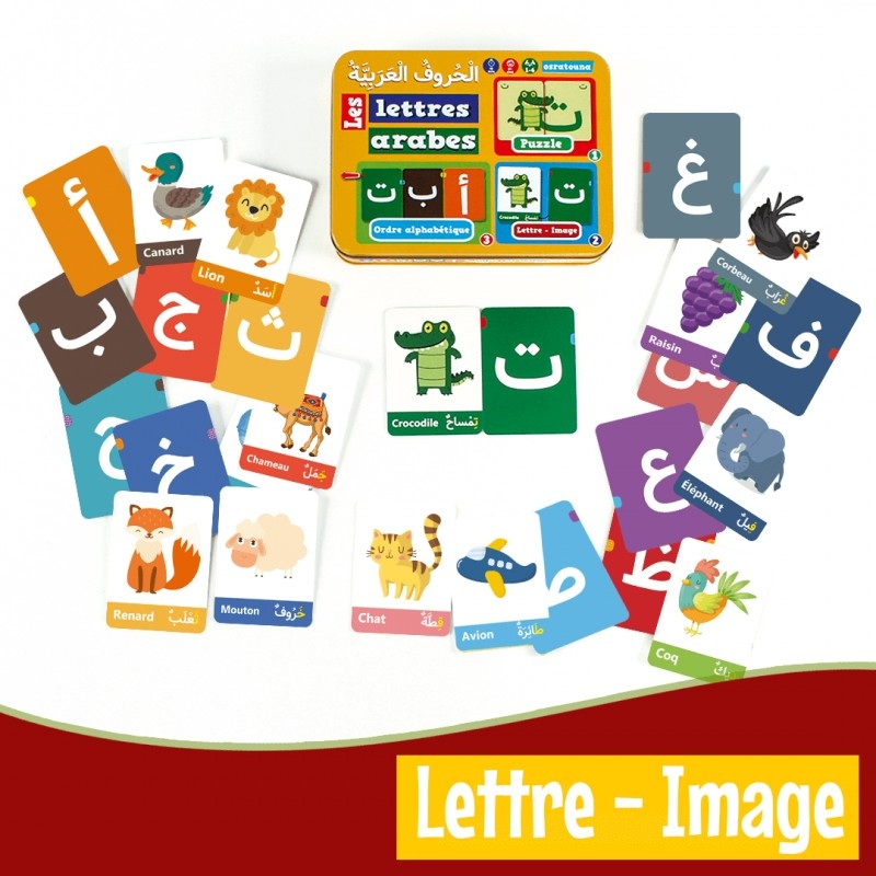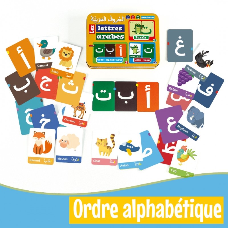 Ce coffret aux illustrations colorées propose 7 jeux évolutifs pour découvrir les lettres et apprendre l'alphabet arabe. L’enfant reconstitue d’abord les puzzles de 2 pièces, puis il associe des lettres à des images grâce au code couleur.