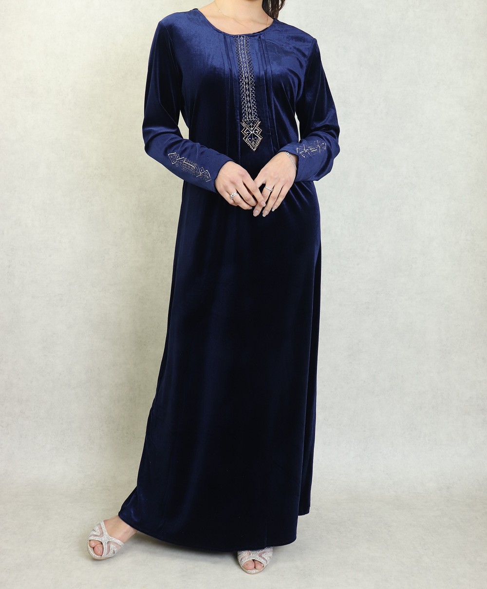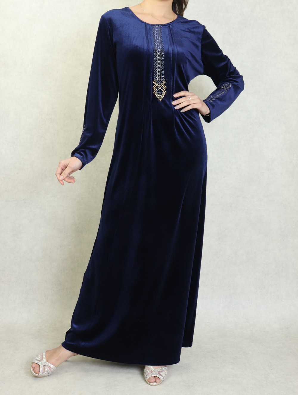 Robe longue, encolure ronde, broderies et strass sur le buste et les poignets, tissu extensible et fluide, effet velours très doux, coupe évasée.