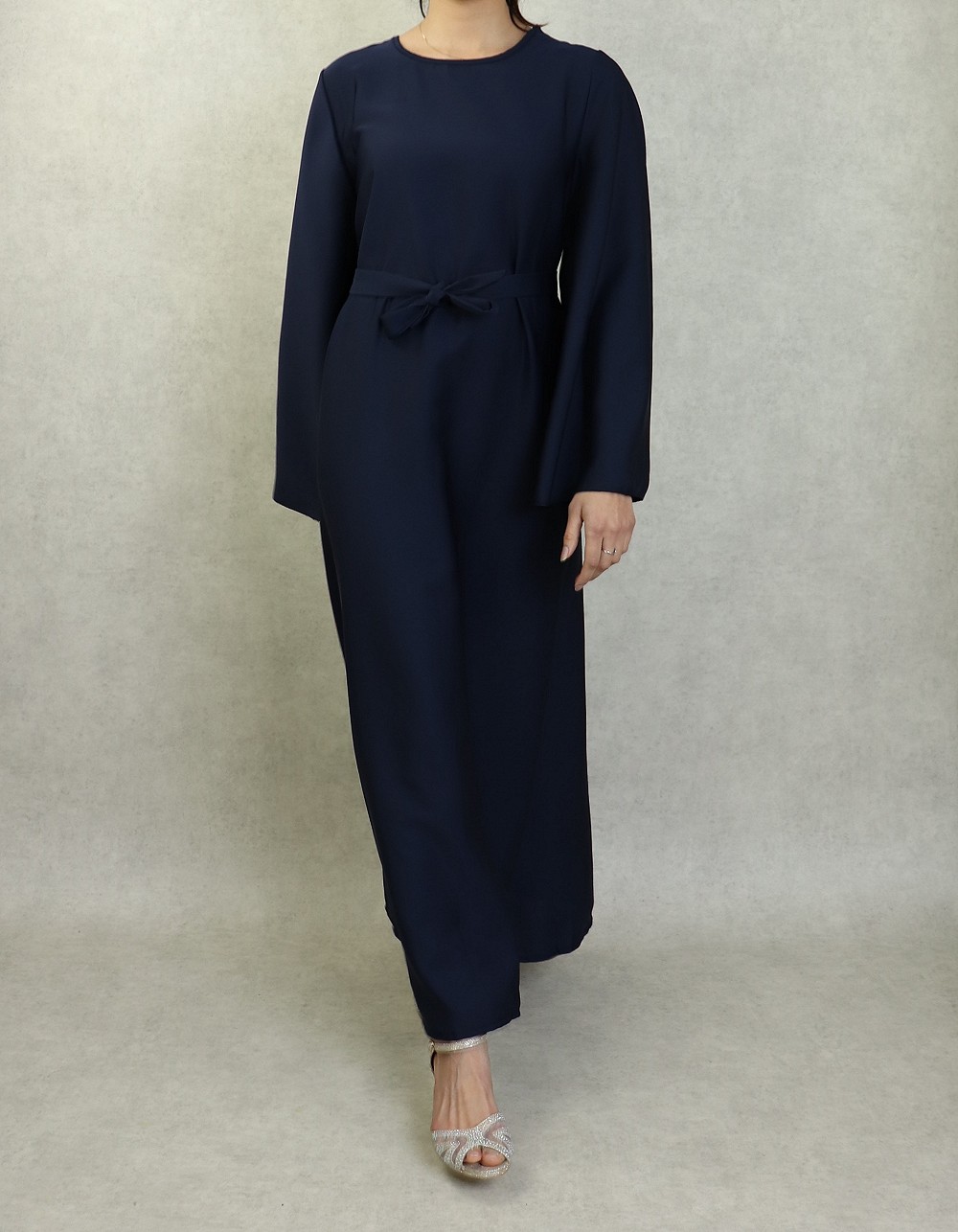 Robe longue manches evasees avec sa ceinture - Couleur Bleu marine