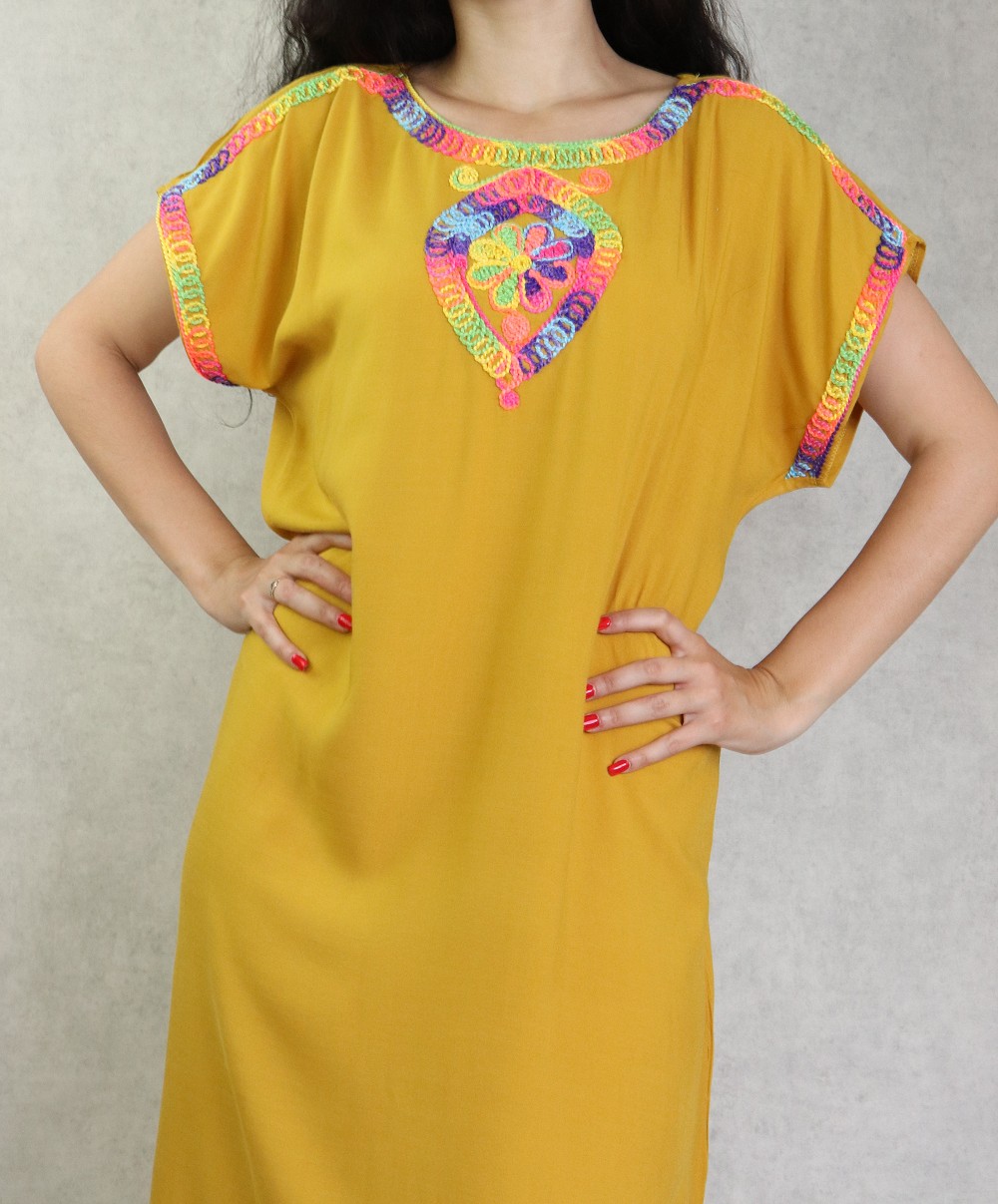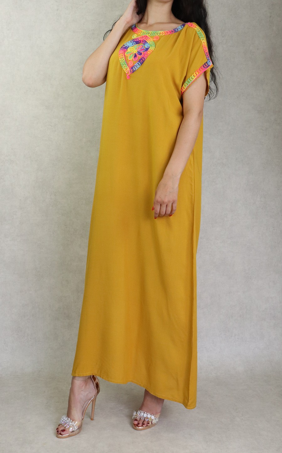 Cette belle robe longue coupe droite, ornée de fils multicolore, col rond.