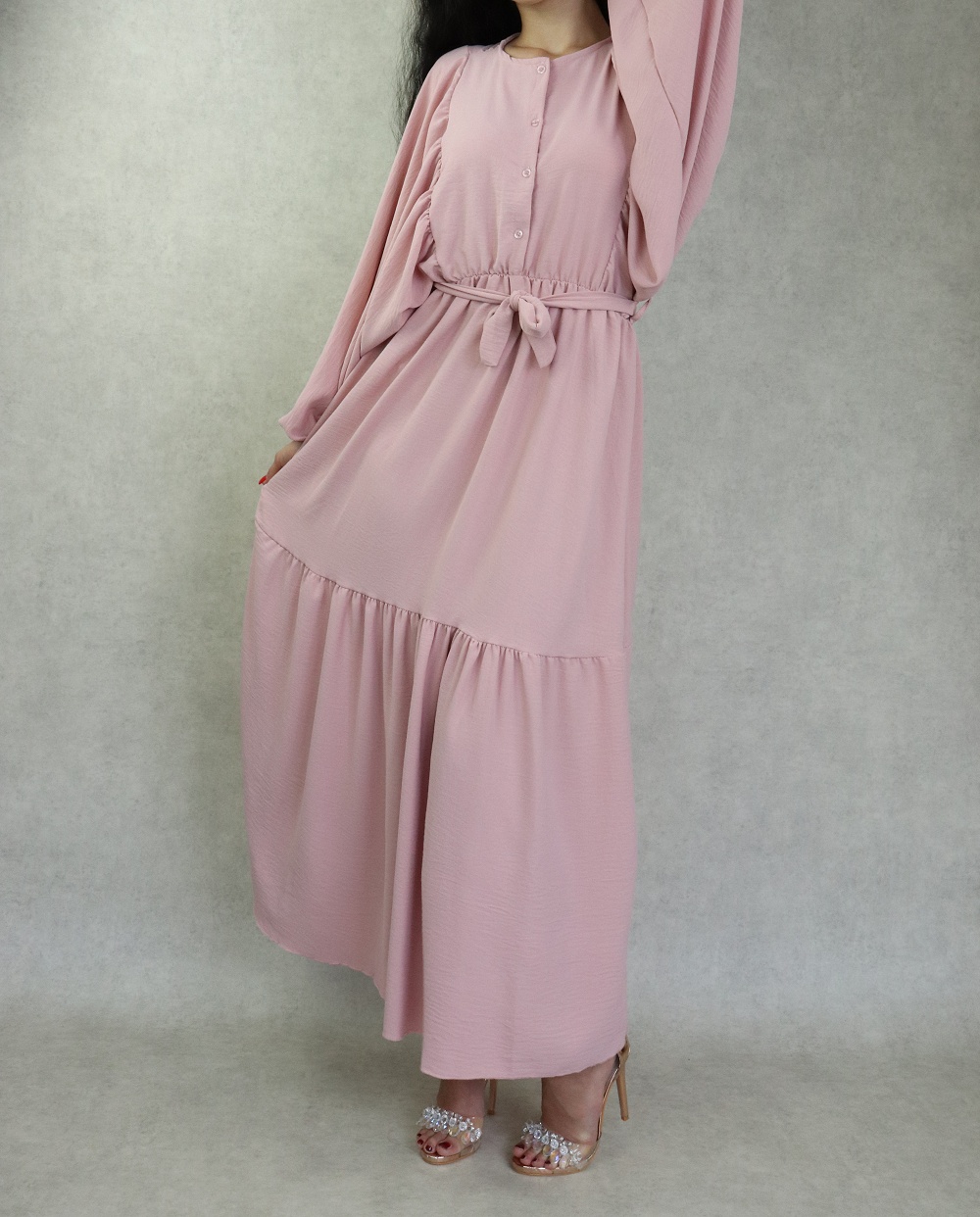 Robe longue, col rond, fermeture boutons sur le buste, taille élastique munie d'une ceinture, tissu fluide, léger et opaque. Manches longues amples esprit chauve-souris resserrées aux poignets.