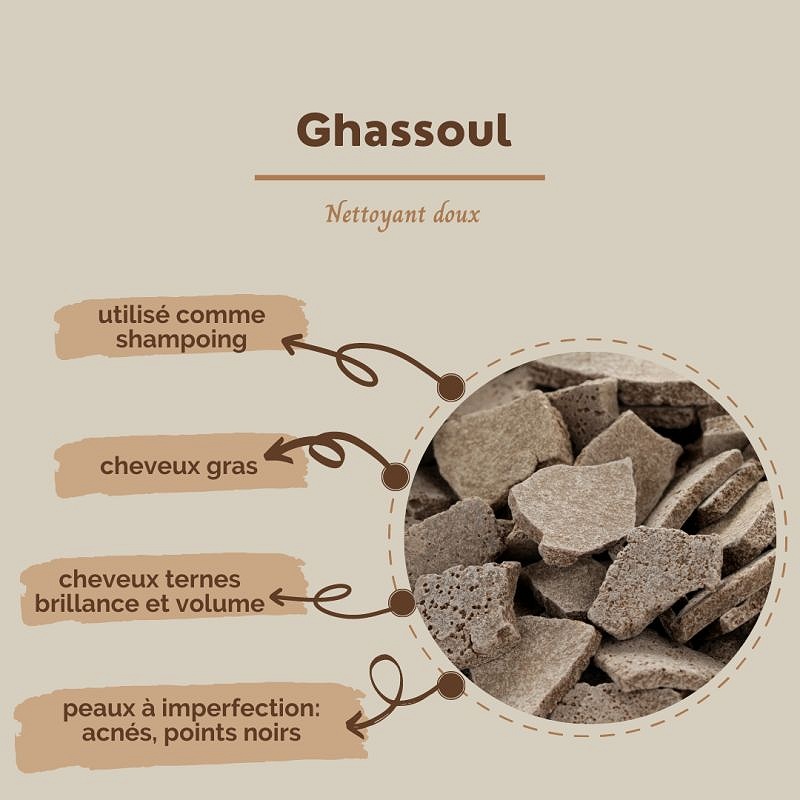Conseils d'utilisation: Mélangez le ghassoul avec l'eau tiède afin d'obtenir une pâte, l'appliquez en masque sur la peau ou en frictions sur les cheveux, rincez.