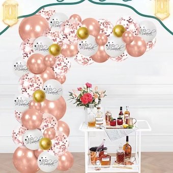 Pack de 50 pièces variées : 20 ballons rose gold 15 ballons confettis 5 ballons dorés 10 ballons blancs Eid Mubarak Ruban et colle