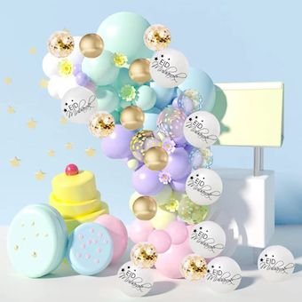 50 pièces variées : 20 ballons pastel 15 ballons confettis 5 ballons dorés 10 ballons blancs Eid Mubarak Ruban et colle.