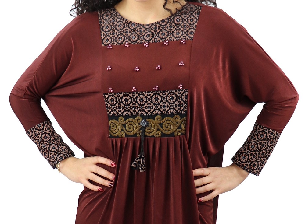 Abaya Marron agrémentée des broderie avec motifs brillants et perles sur le devant ainsi que sur les poignet, manches style papillons.
