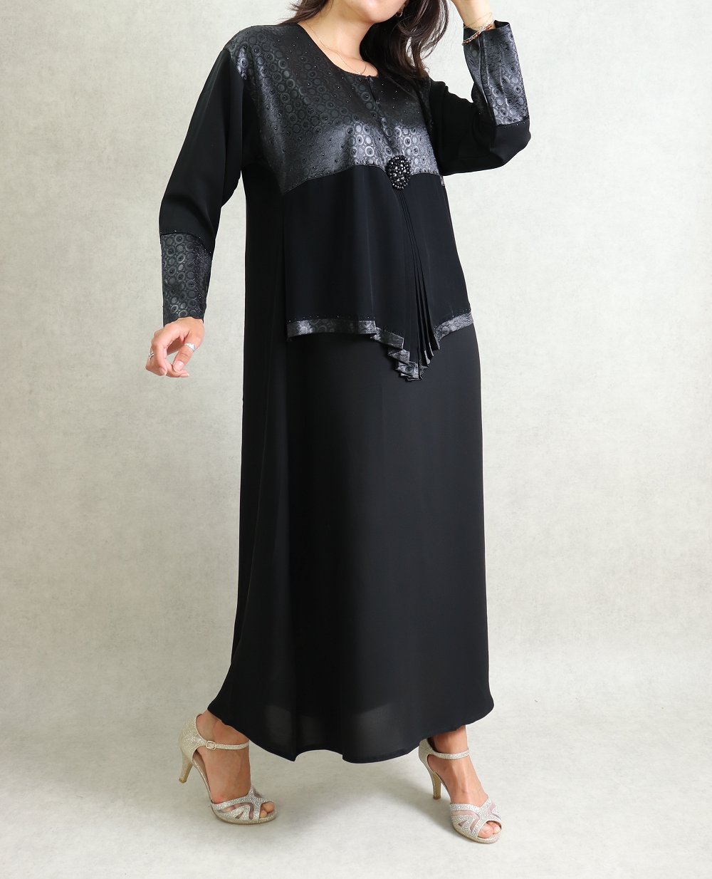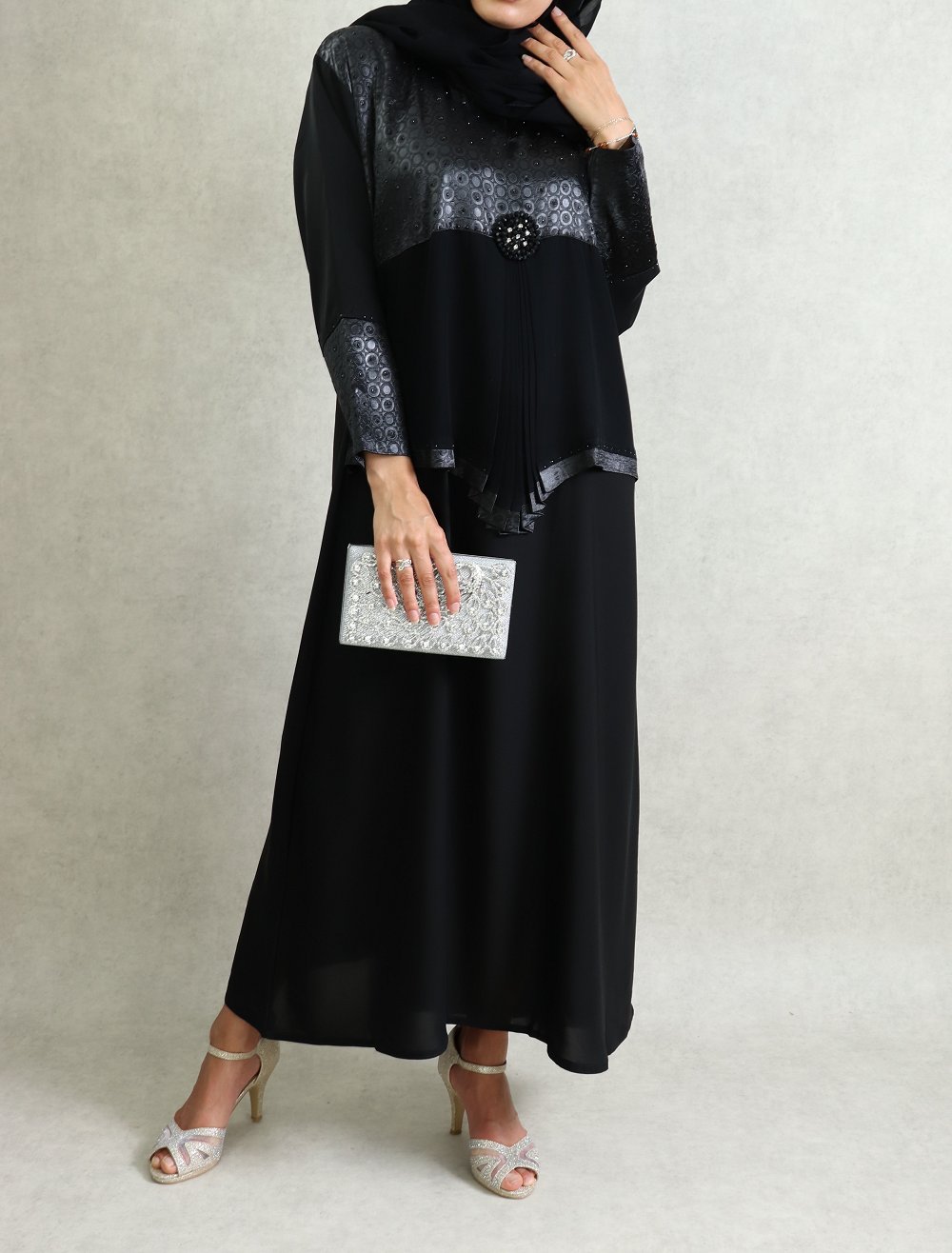 Abaya noire assortie de un haut satiné, ainsi que sur chacune des poignets. Le coté original de cette abaya est le beau tablier en effet mousseline qui donne un coté très classe à celle-ci. Foulard assorti.