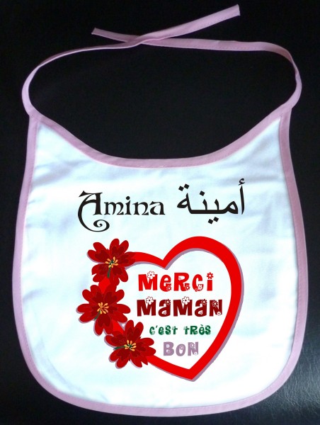 Bavoir "Merci maman, c'est très bon !" personnalisable avec le prénom de l'enfant écrit en arabe et en français.