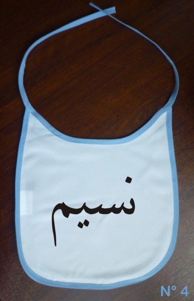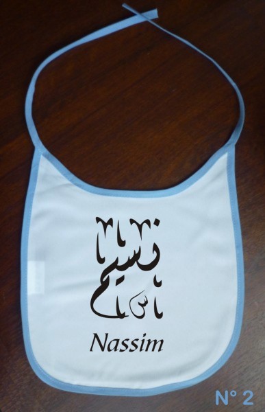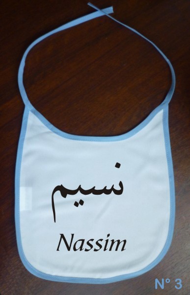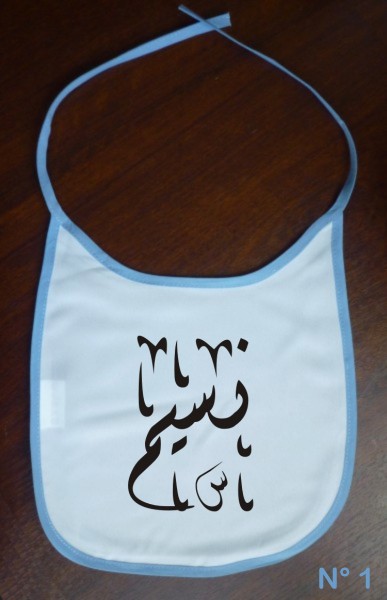 Bavoir pour bébé avec prénom personnalisé en arabe et/ou français. Vous pouvez choisir un prénom calligraphié en arabe ou écrit normalement. Excellente idée cadeau pour une naissance.