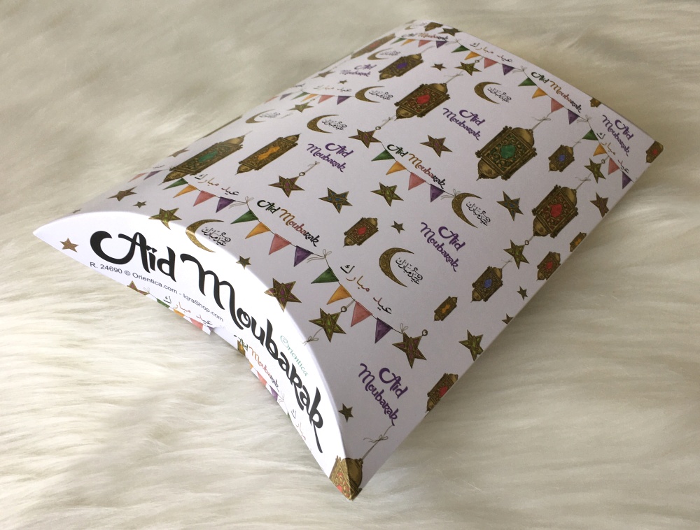 Boite cadeau sous forme d'étui qui peut s’ouvrir des deux côtés avec inscriptions Aïd Moubarak en français et en arabe.