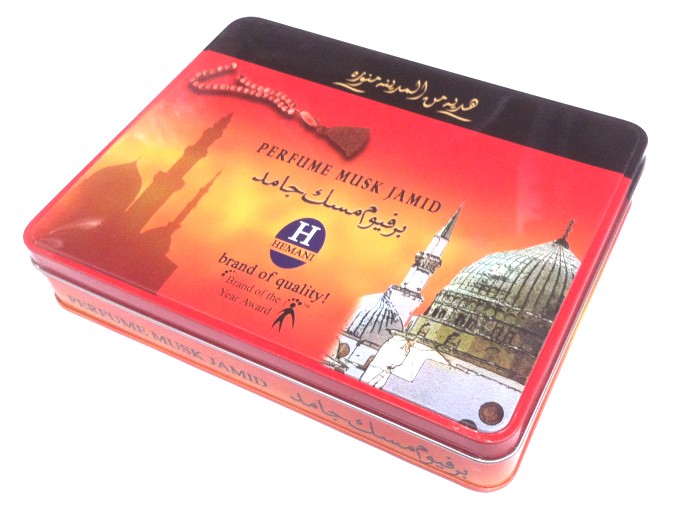 Jolie boite métallique contenant un assortiment de 16 morceaux de muscs solides emballés individuellement.