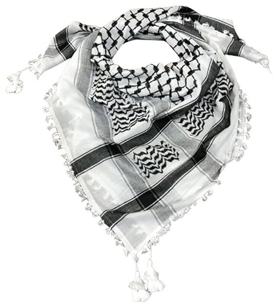 Le fameux foulard palestinien (Keffieh palestinien), symbole de résistance. Grand foulard palestinien de 1,20m de coté. C'est une Ghutra palestinienne classique avec motifs noirs sur fond blanc.
