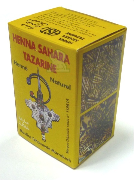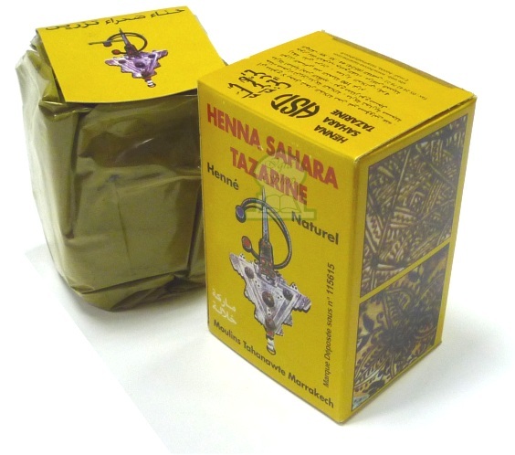 Henna Sahara Tazarine de qualité supérieur, 100% naturel sans produits chimiques. Utilisé pour le soin des cheveux et pour le tatouage temporaire de toute les parties du corps. Le henné doit son pouvoir colorant à la présence d'un tanin naturel qui se fixe sur la kératine du cheveu. Le henné ravive la chevelure et l'enrichit de reflets nuancés, il renforce les racines et gaine le cheveu. Ainsi protégé, le henné préserve les fonctions vitales du cheveu et assure à votre coiffure, souplesse, éclat et couleur. Les feuilles de henné séchées sont réduites en poudre à laquelle on ajoute de l'eau de rose et de l'eau ordinaire.