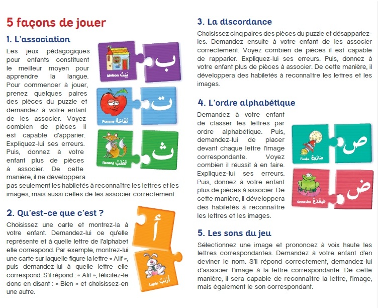 Fourni avec mode d'emploi en langue française détaillant les 5 façons de jouer.