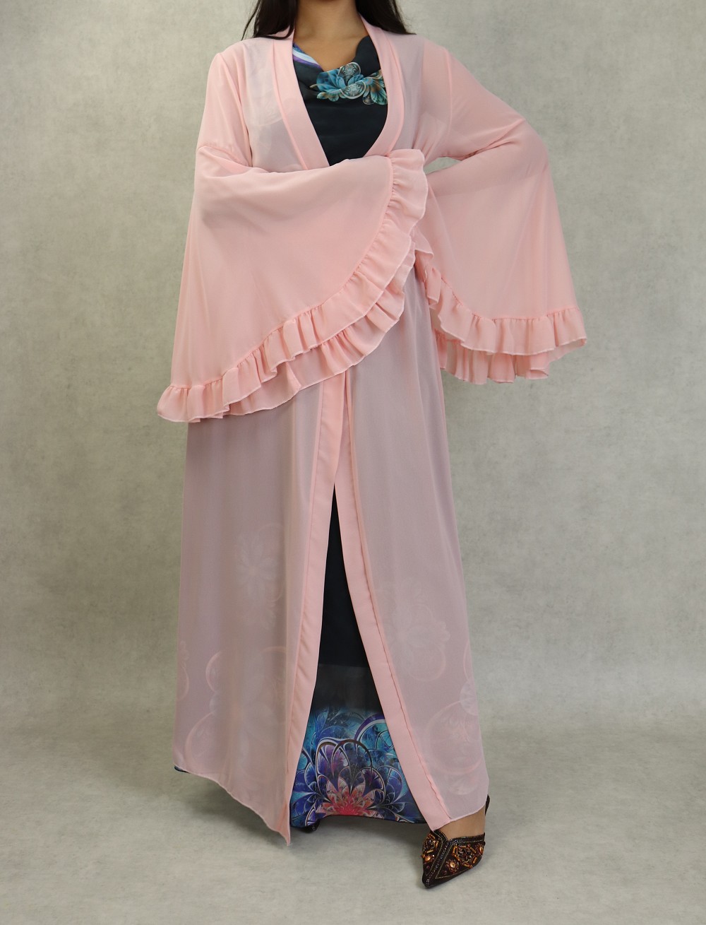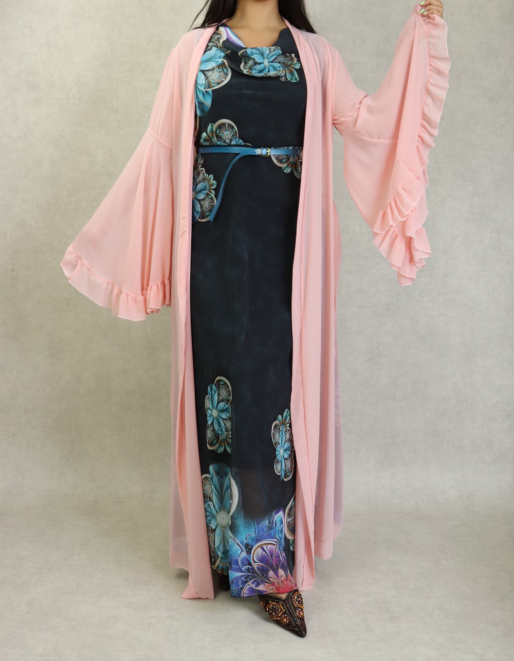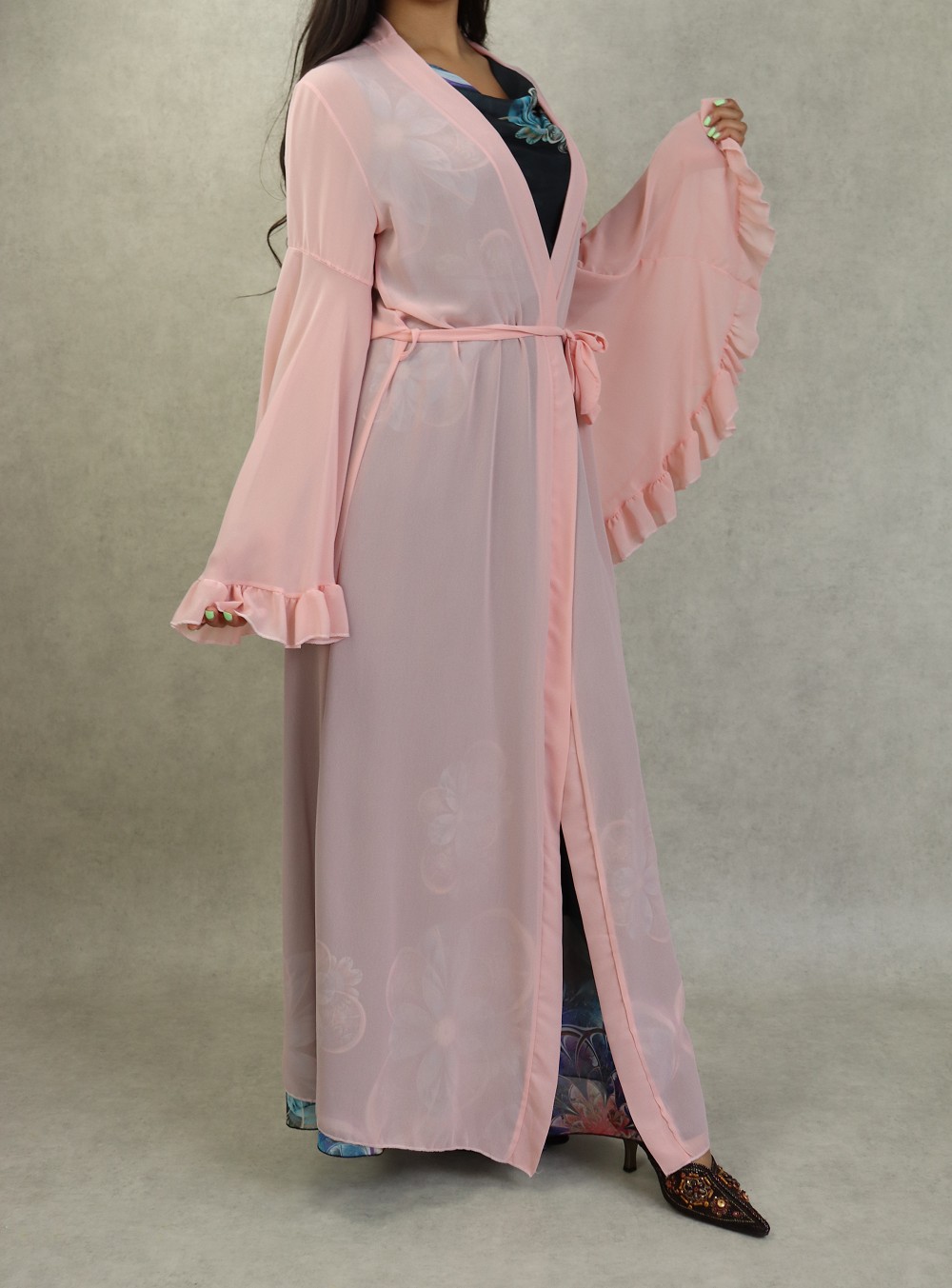 Kimono style bohème long, avec manches cloches et évasées, le tout accompagné d'une ceinture. Très joli à porter sur une robe.
