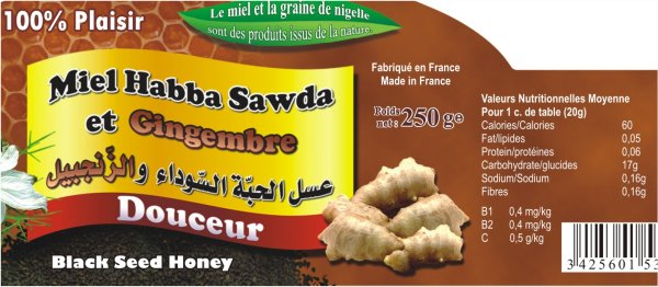 Ingrédients : Miel de montagne, graine de nigelle (habba sawda), gingembre, gelée royale, graine de pollen d'abeille, propolis.