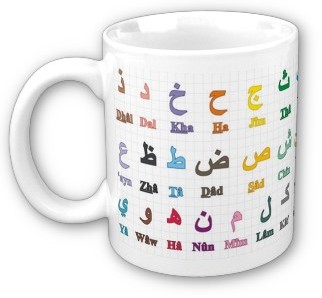 Mug permettant de réviser les 28 lettres de l'alphabet arabe.