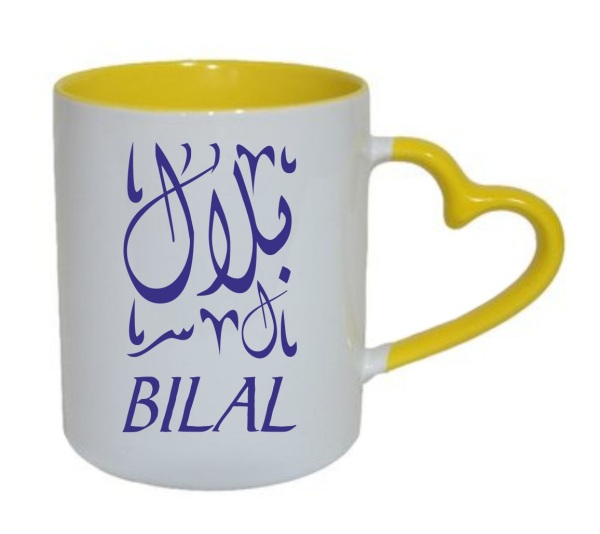 Profitez de recevoir cette tasse avec anse (poignée sous forme de coeur et intérieur jaunes) avec l'inscription du prénom calligraphié en arabe et/ou en français ou un message en français. S'il s'agit d'un prénom, vous pouvez choisir un style parmi les quatre (voir image ci-dessous).