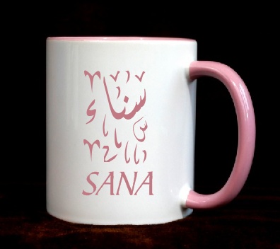 Profitez de recevoir cette tasse avec l'inscription du prénom calligraphié en arabe et/ou en français (comme sur la photo) ou un message en français. S'il s'agit d'un prénom, vous pouvez choisir un style parmi les quatre (voir image ci-dessous).