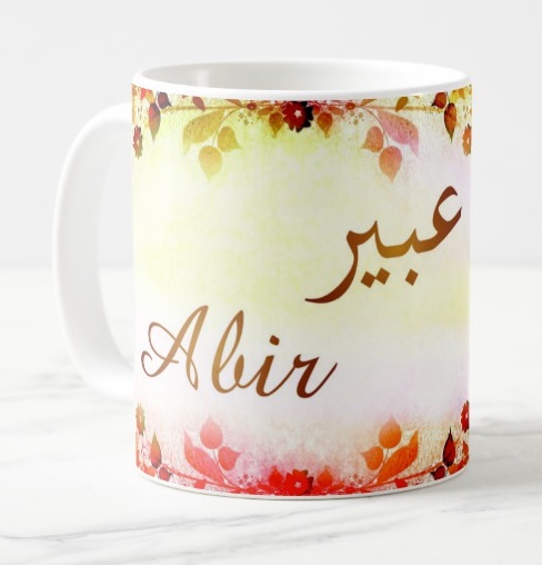 Mug avec le prénom Abir calligraphié en arabe ainsi que son écriture normale en arabe (عبير) et en français.