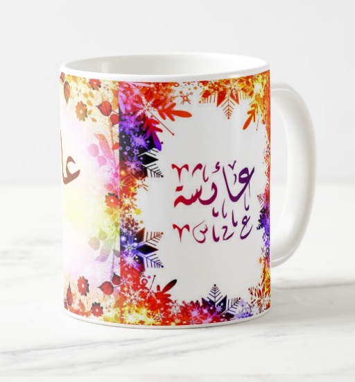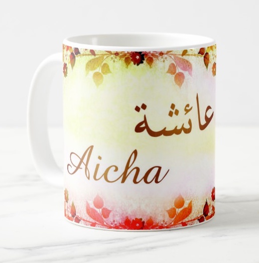 Mug avec le prénom Aicha calligraphié en arabe ainsi que son écriture normale en arabe (عائشة) et en français.