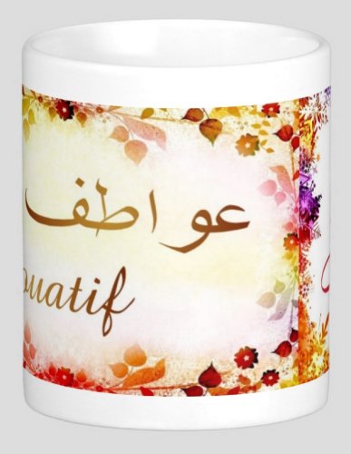 Mug avec le prénom "Aouatif" écrit en français, en arabe (عواطف) et calligraphié de façon artistique en arabe sur la partie droite.