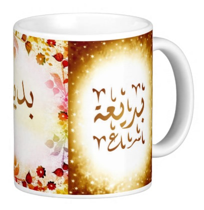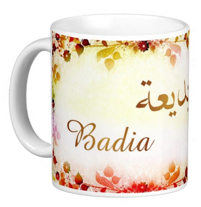 Mug avec le prénom "Badia" écrit en français, en arabe (بديعة) et calligraphié de façon artistique en arabe sur la partie droite.