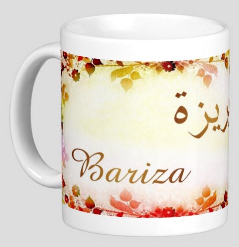 Mug avec le prénom "Bariza" écrit en français, en arabe (بريزة) et calligraphié de façon artistique en arabe sur la partie droite.