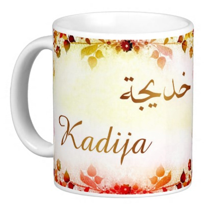 Mug avec le prénom "Kadija" écrit en français, en arabe (خديجة) et calligraphié de façon artistique en arabe sur la partie droite.