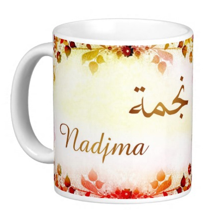 Mug avec le prénom "Nadjma" écrit en français, en arabe (نجمة) et calligraphié de façon artistique en arabe sur la partie droite.