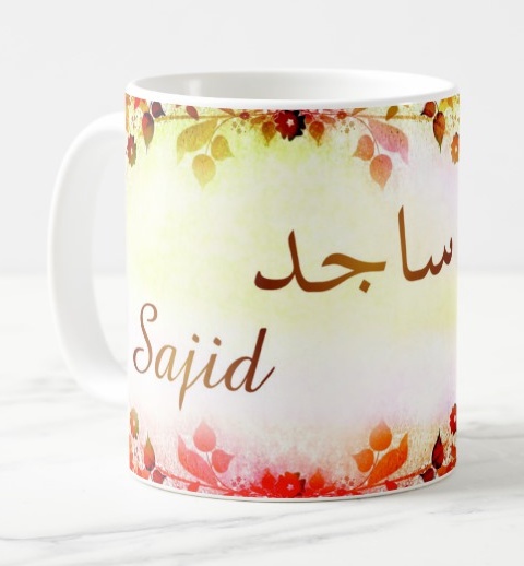 Mug avec le prénom Sajid calligraphié en arabe ainsi que son écriture normale en arabe (ساجد) et en français.