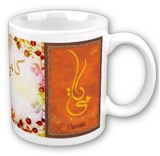 Tasses (mugs) en céramiques avec inscriptions calligraphiques artistiques arabes des prénoms. Oeuvre unique... Idée originale de cadeau ! La tasse passe au four micro-ondes et au lave-vaisselle sans problème. Contenance : 350 ml. Les mugs sont livrés dans une boite blanche cartonnée. Ils sont résistants et ne perdent pas leurs couleurs avec le temps. Vous avez également un grand choix de mugs personnalisables ainsi que des mugs sur d'autres thèmes.
