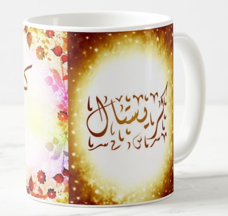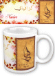 Mug avec le prénom "Christelle" écrit en français, en arabe (كريستال) et calligraphié de façon artistique en arabe sur la partie droite.