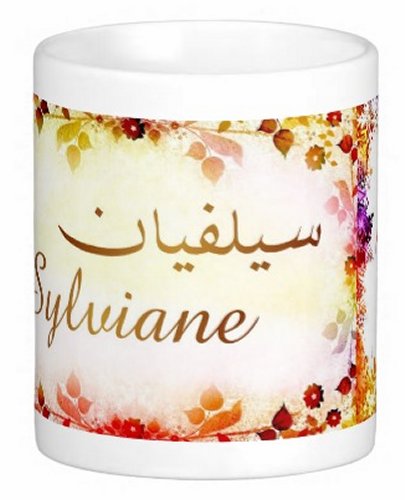 Mug avec le prénom "Sylviane" écrit en français, en arabe (سيلفيان) et calligraphié de façon artistique en arabe sur la partie droite.